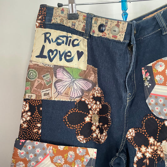Upcycled Shabby Chic Rustic Love Frayed Patched Denim Jeans Upcycle Australian size approximately 12/14/16Regular price $95.00 AUDRegular priceUnit price / per-