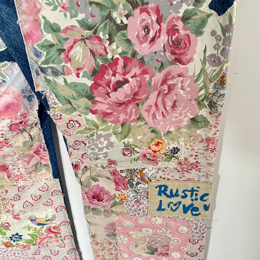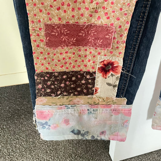 Upcycled Dark Denim Floral Patchwork Rustic Love Shabby Chic Frayed Adjustable Jeans UpcycleRegular price $0.00 AUDRegular priceUnit price / per-