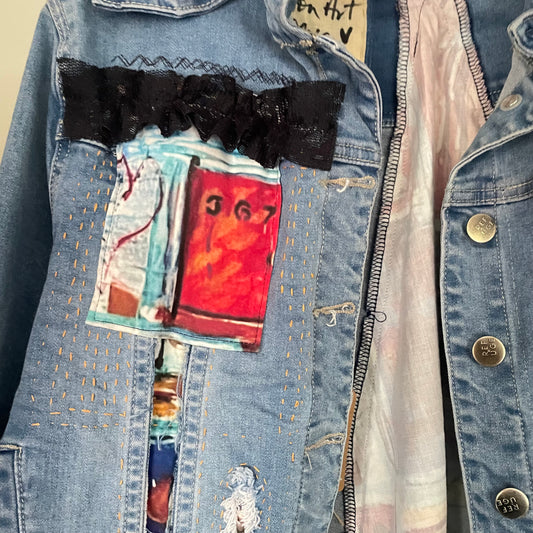 Upcycled Street Wear Style Denim Distressed Jacket with Hand Stitched Rustic Love Shabby Chic Frayed Upcycle.Sz LRegular price $85.00 AUDRegular priceUnit price / per-