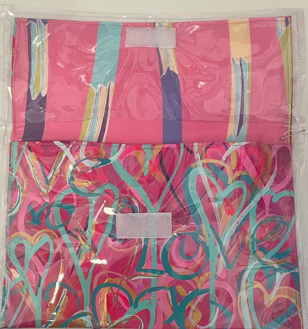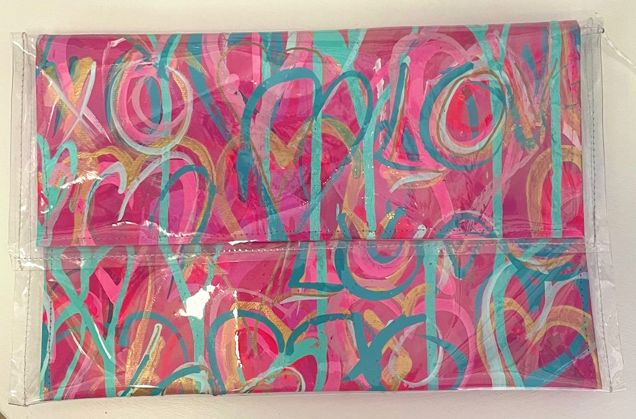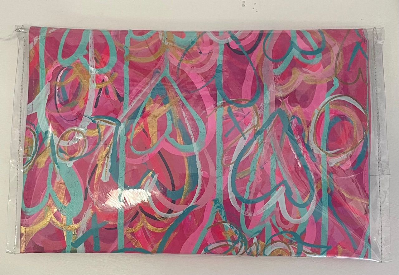 "A Golden Love" Art Clutch Purse is made from an original canvas artwork by Julie Weston with a pink geometric Cotton lining.