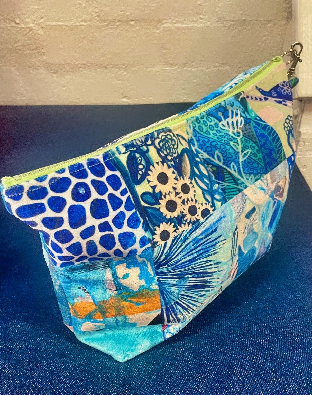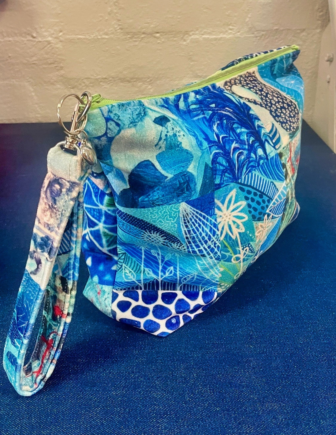 "Blue Patchwork' Toiletries Bag is printed from a culmination of several blue artworks an patchworked together by Julie Weston.