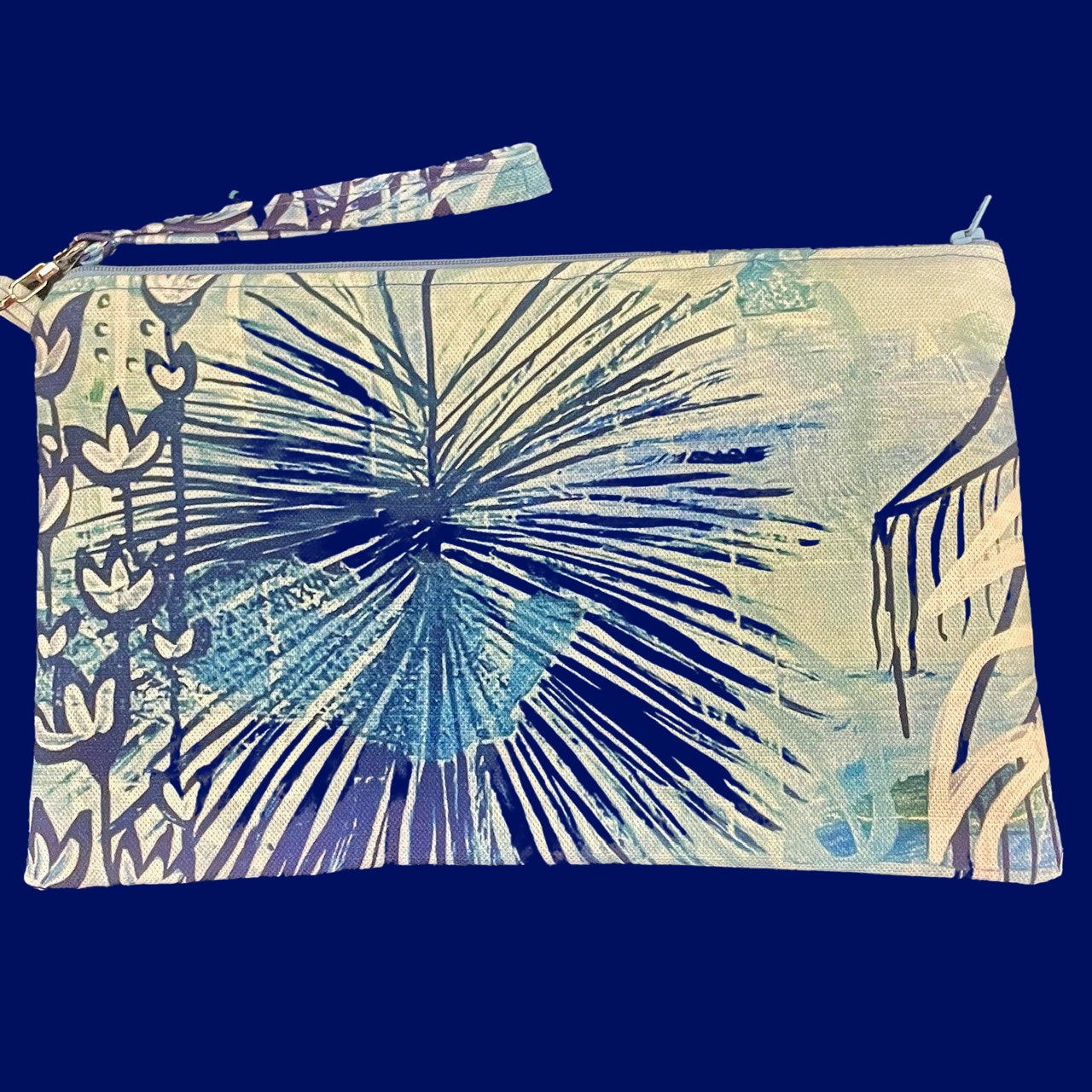 In abstract summery blue and white vibes it comes with a zip, detachable hand strap and lined in a blue and white patterned fabric.