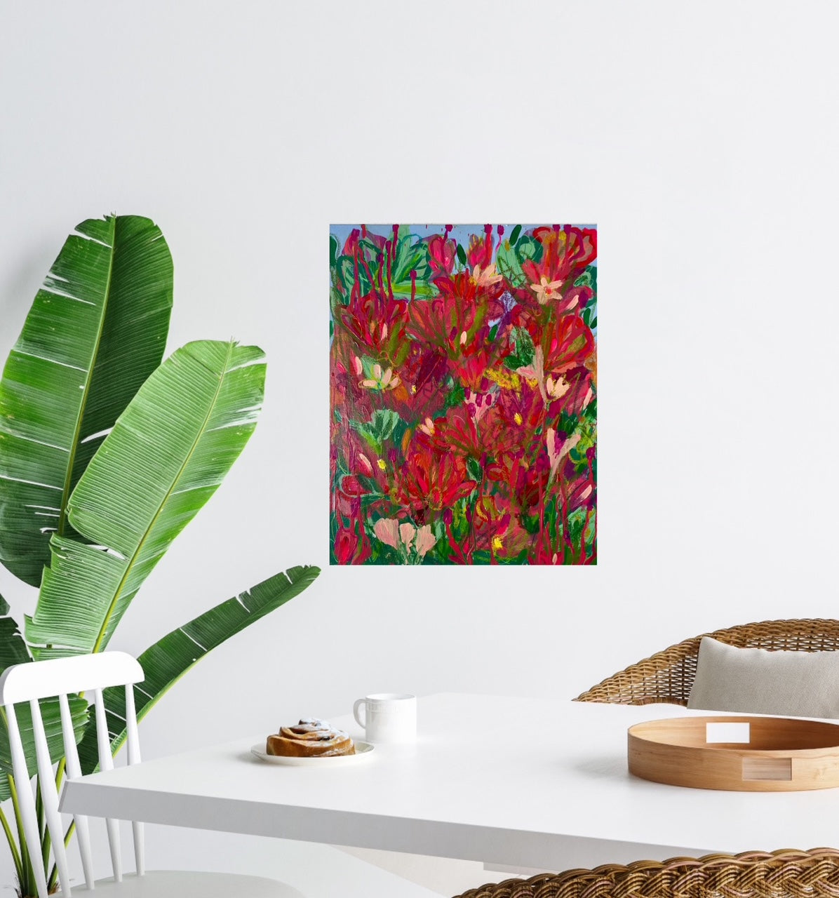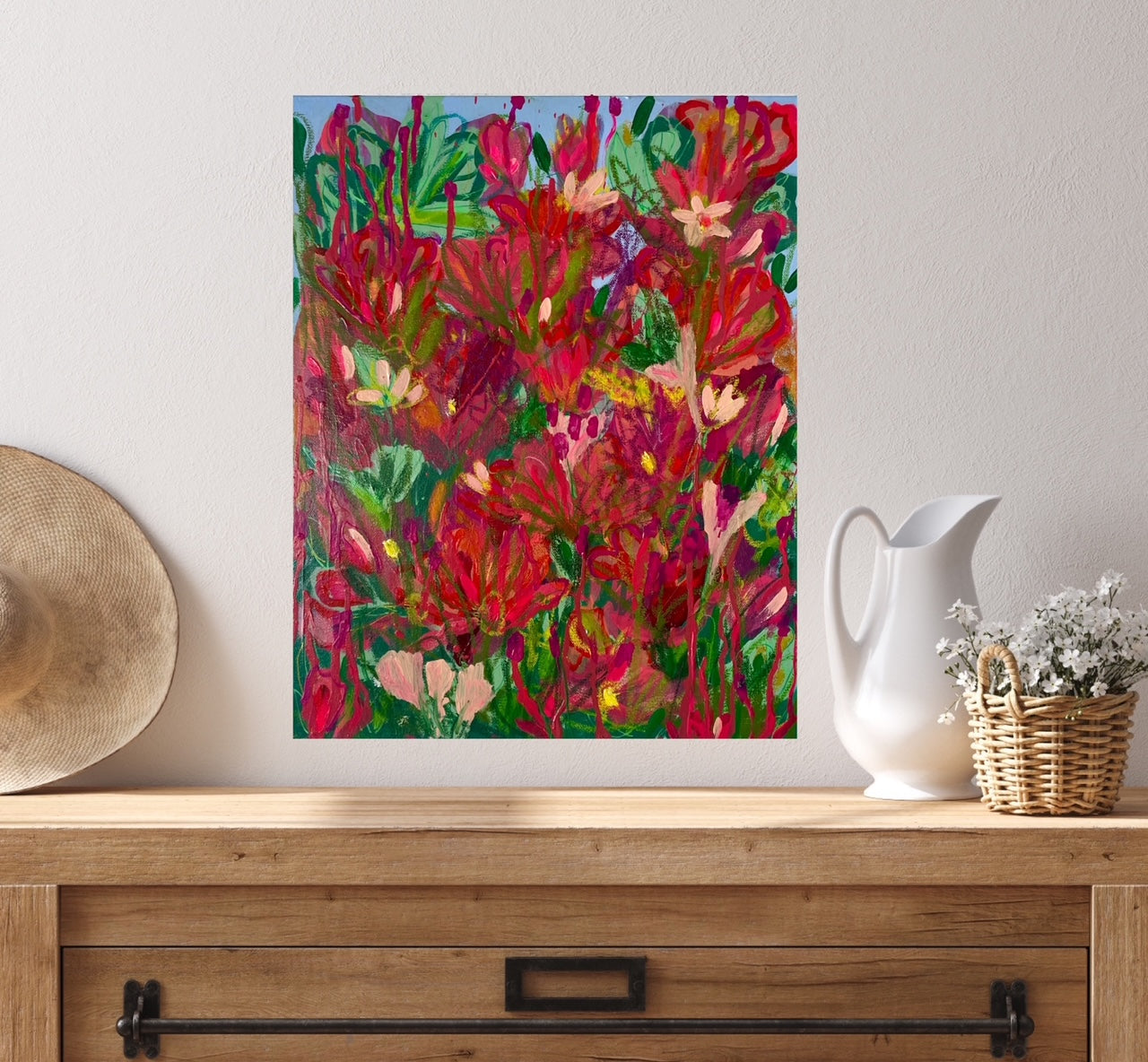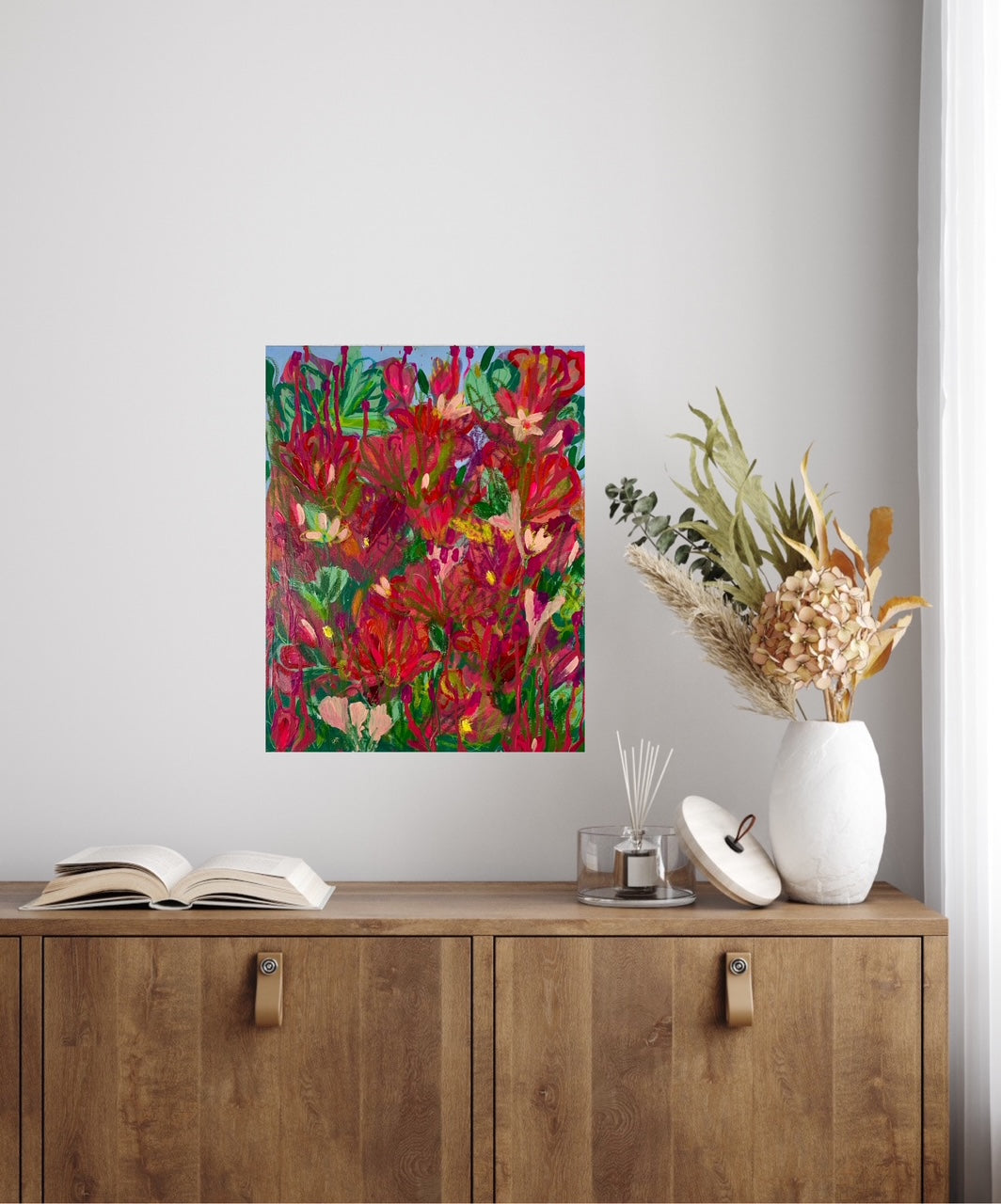 Garden Riot is an abstract view of flowers in a riot of red colours and greenery.