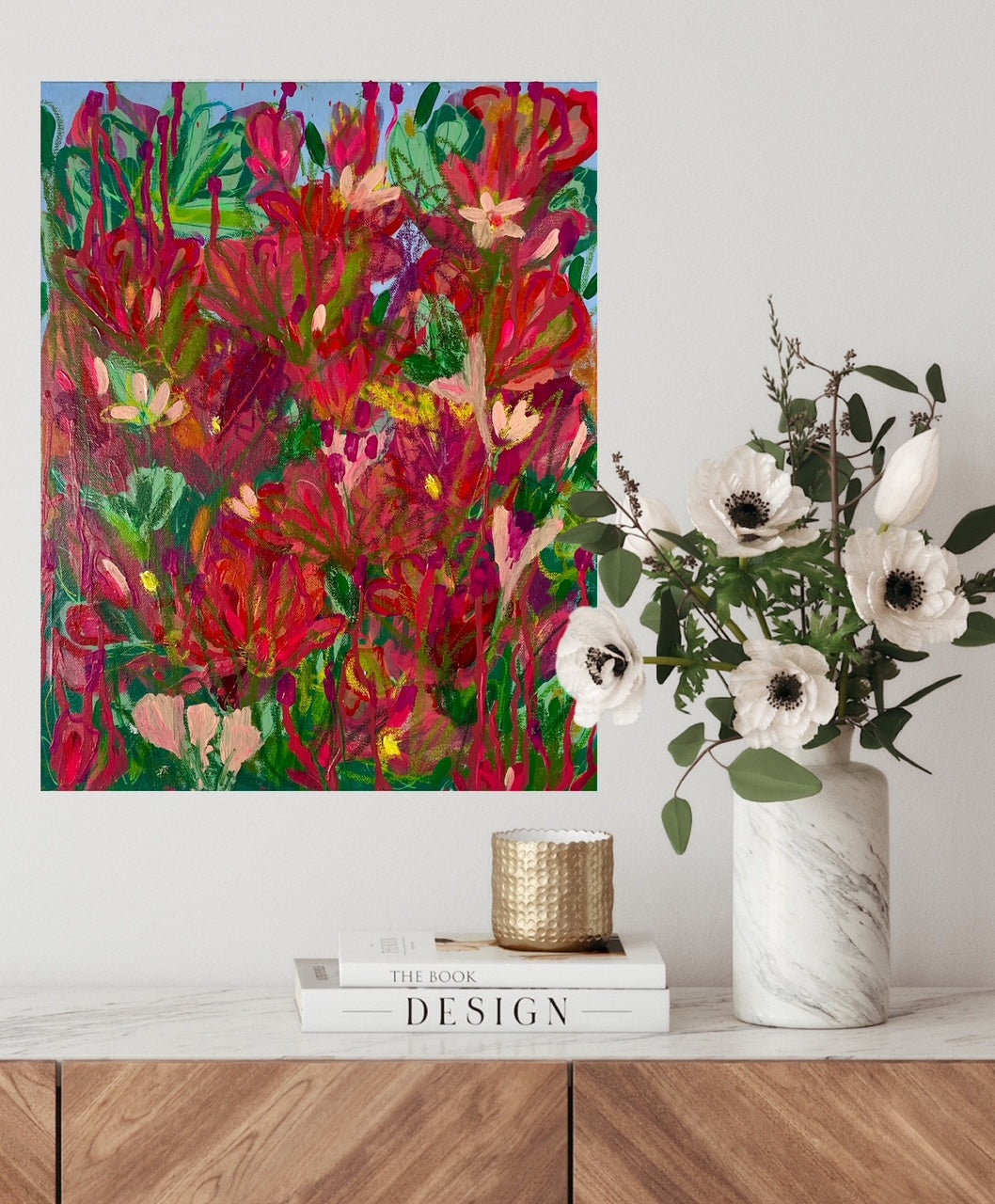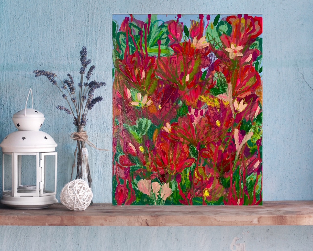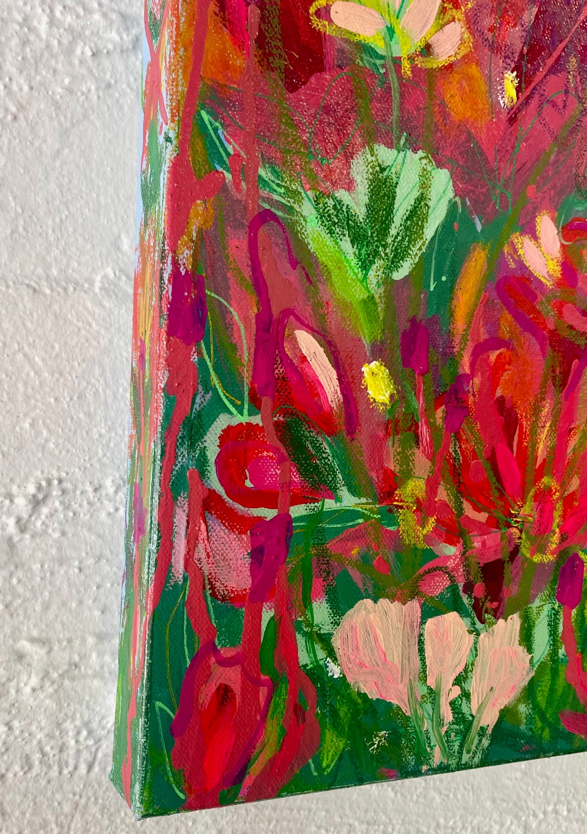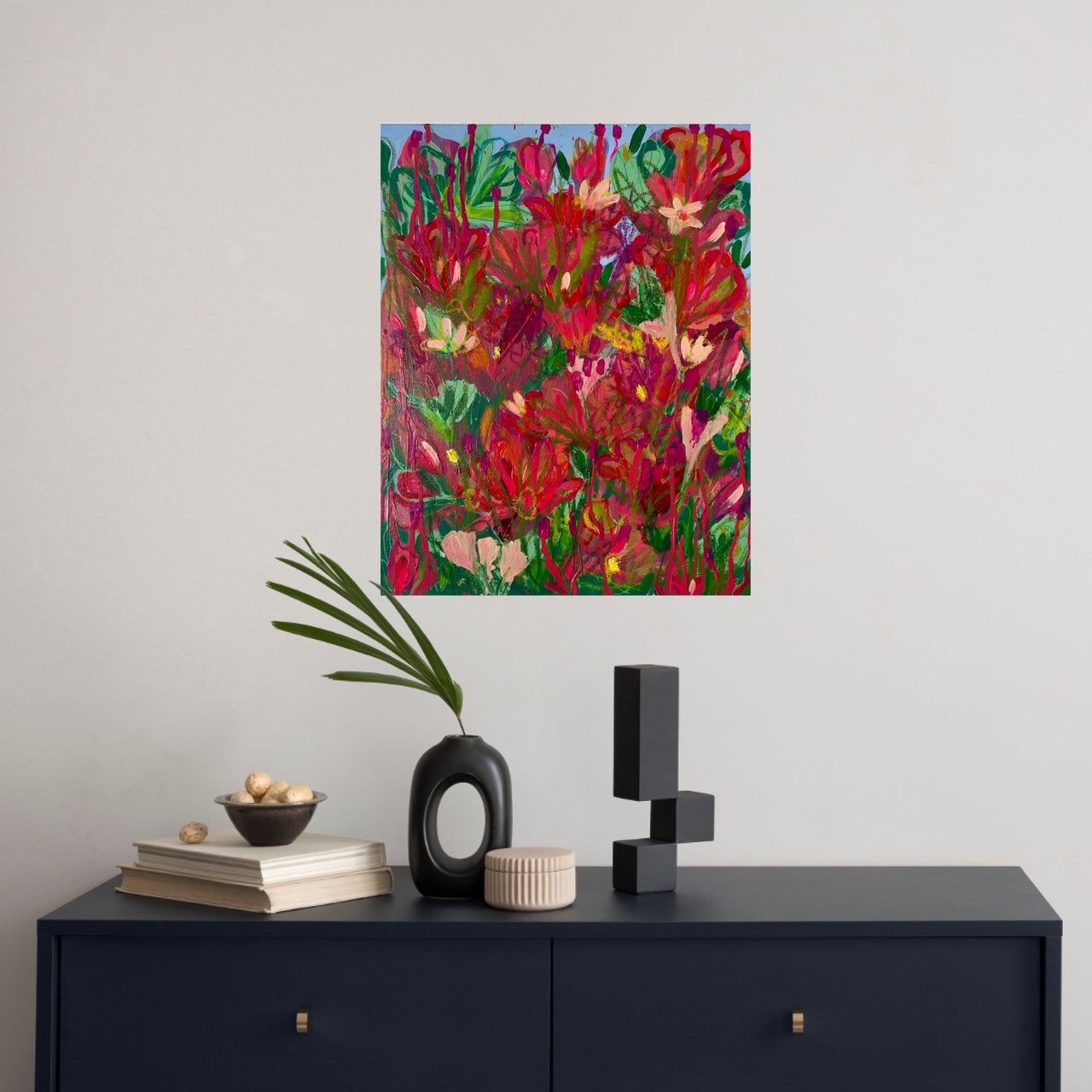 Garden Riot is an abstract view of flowers in a riot of red colours and greenery.