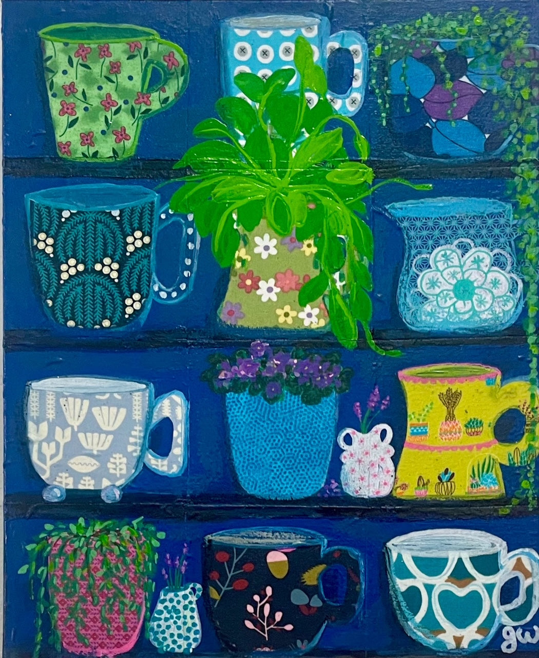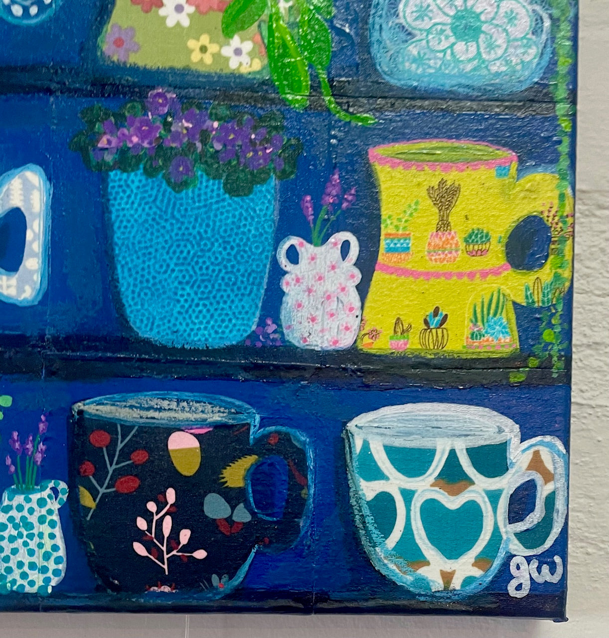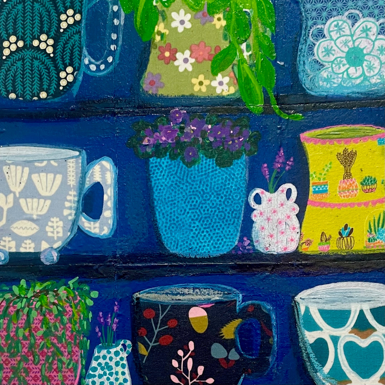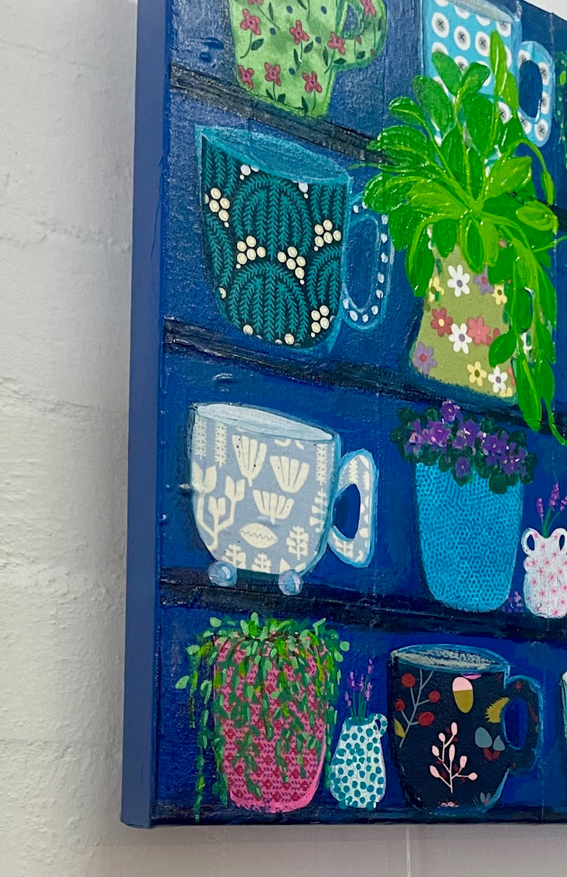 This little artwork was worked with squares of fabrics and then I paint cups and vases and added greenery and little objects on shelves. I have always loved to collect mugs, cups, crockery, vases and jugs. The endless variety of pattern and colour in these items are a constant inspiration for my artwork and creativity.