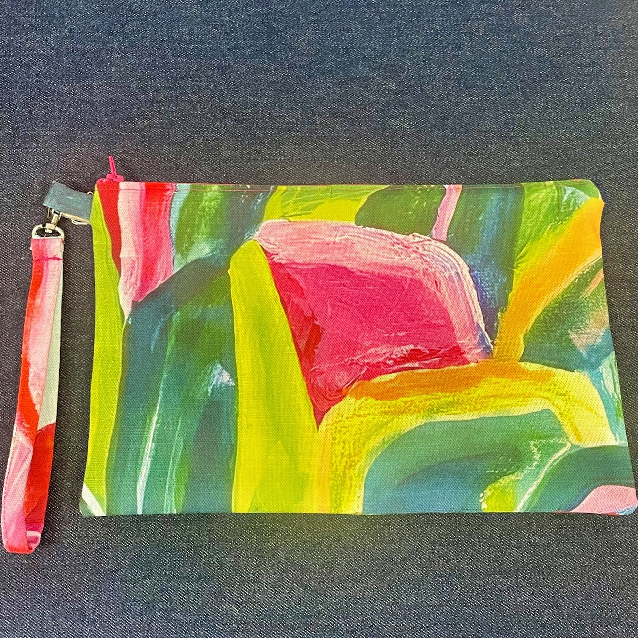 In abstract mountain landscape vibes in pink, gold and turquoise hues, it comes with a zip, detachable hand strap and lined in a pink floral cotton fabric.