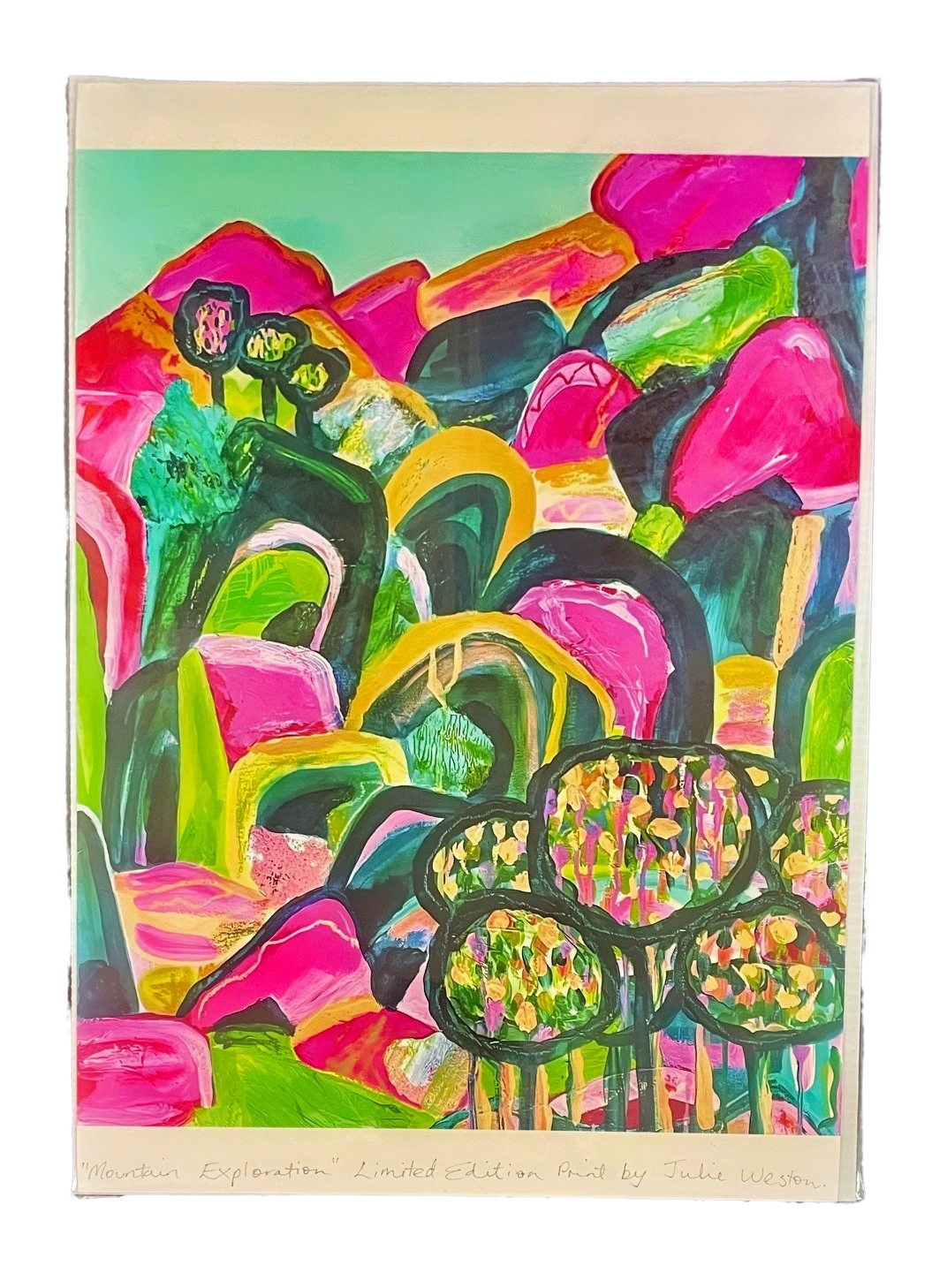 "Mountain Exploration" Art Print from an original mixed media artwork by Julie Weston depicting gorgeous rock and mountain formations in the colours of pink, fuschia, teal, turquoise, blue, gold, and green.