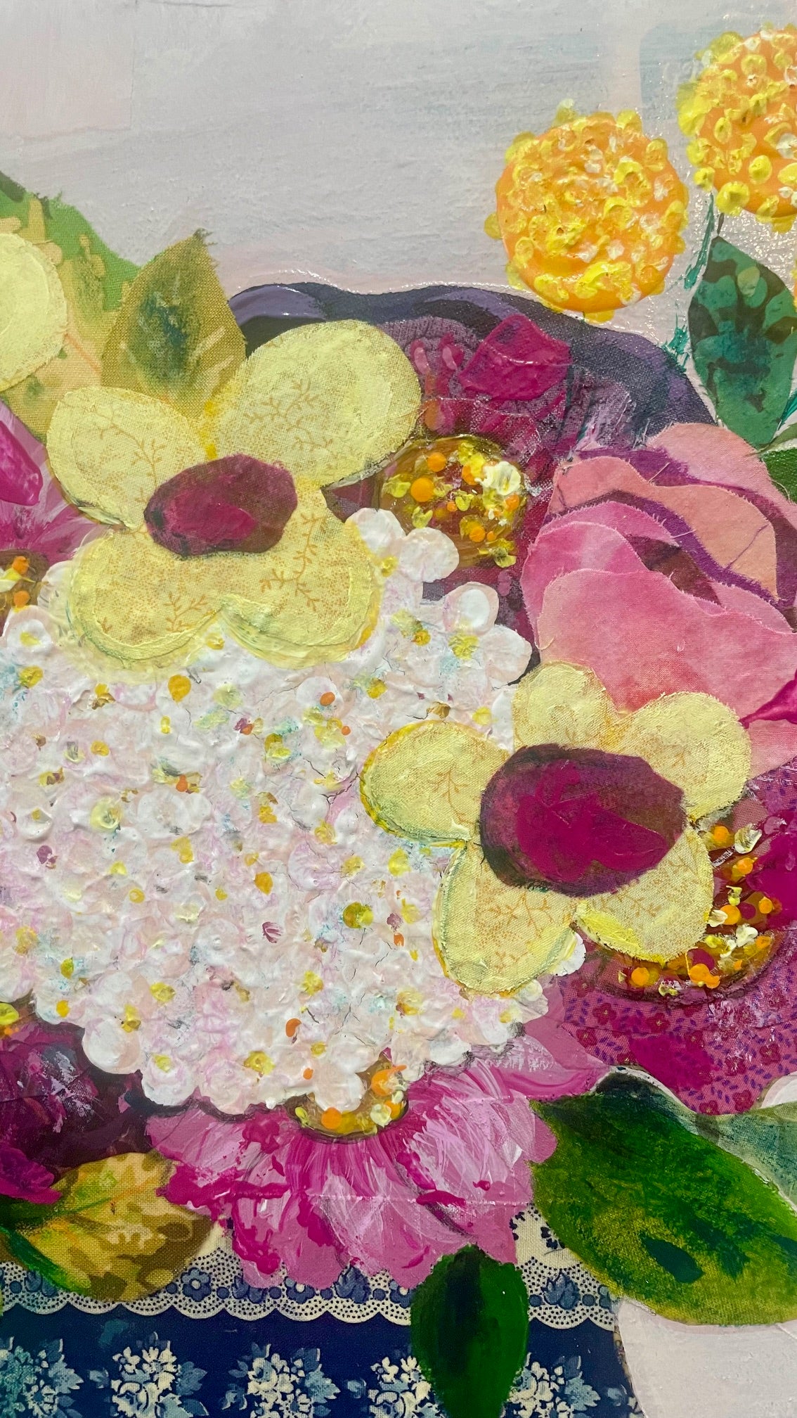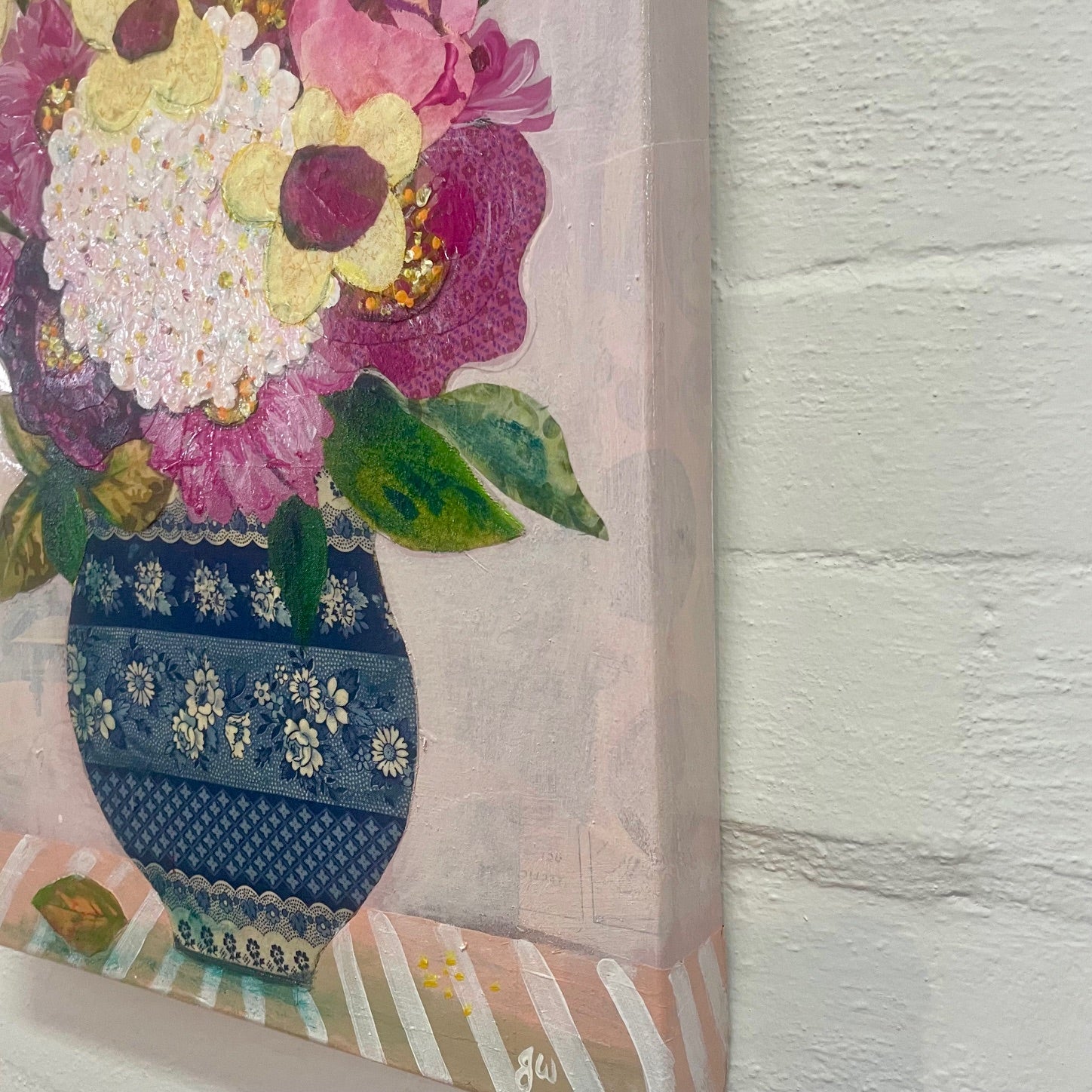 A cute little mixed media fabric and acrylic paint collage on canvas. A rustic little gathered bunch of flowers in a blue and white fabric pot with fabric and hand painted flowers and greenery. Two coats of artist quality gloss acrylic varnish has been applied for longevity. This little artwork would enhance a country or rustic style home or added to a gallery wall in your collection.