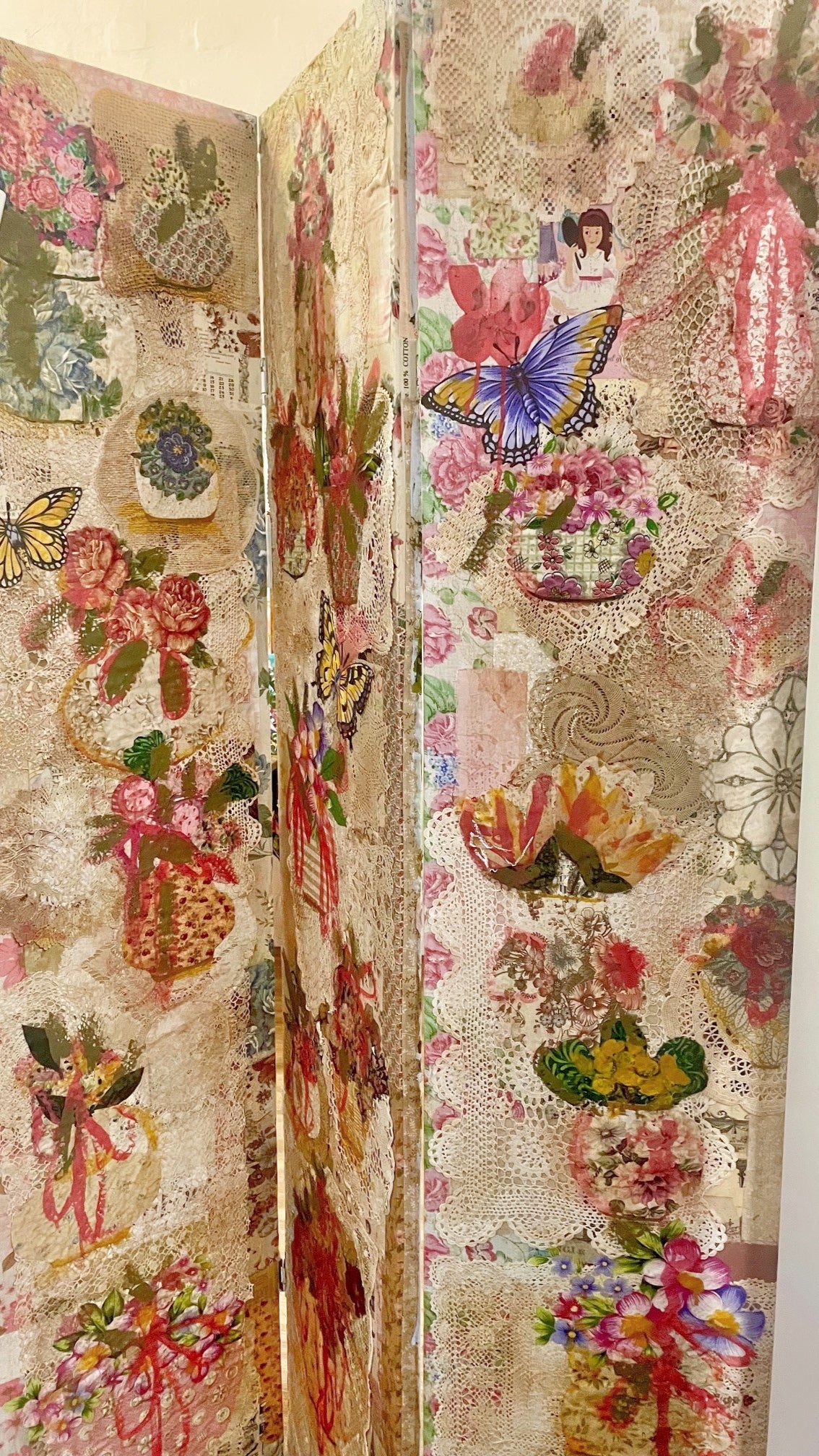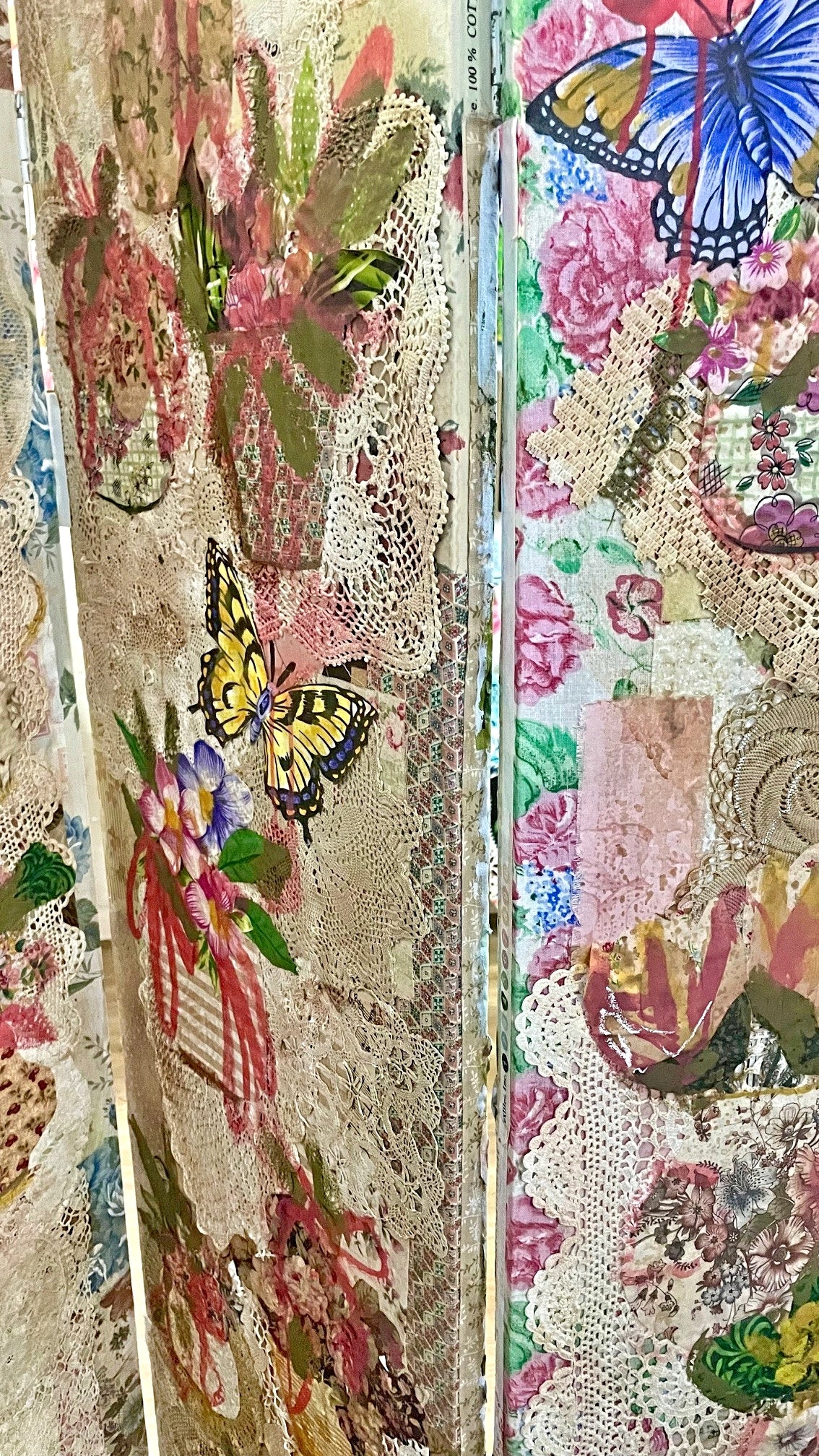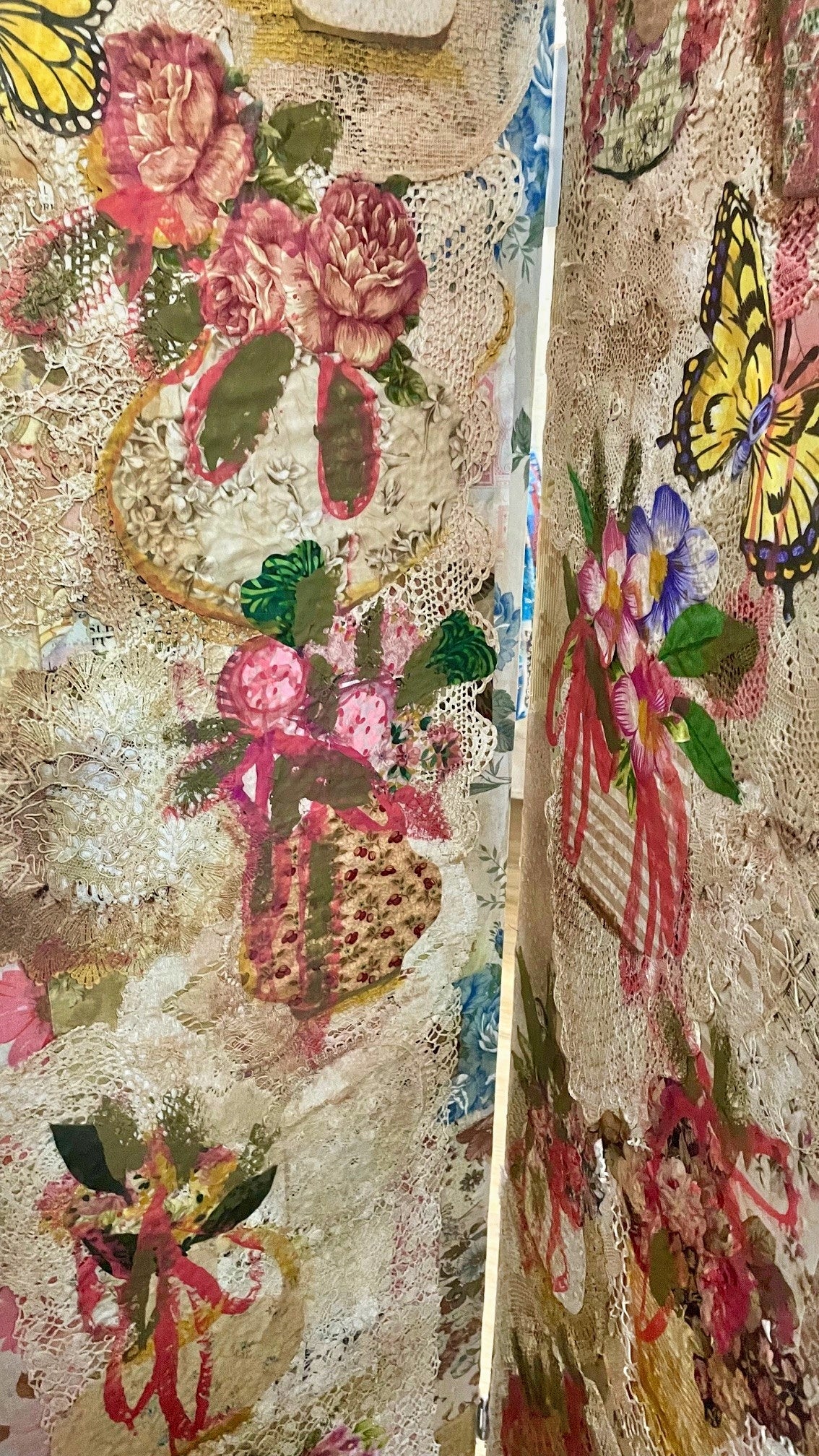 The reverse side has layers of vintage papers and fabrics with vintage doilies depicting vases of flowers placed on the doily tablecloths, with acrylic paint.